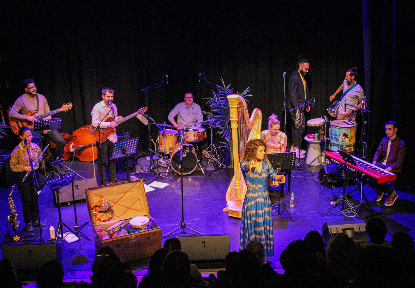 The ensemble is known for presenting traditional Brazilian rhythms alongside contemporary arrangements. Their performances highlight characteristic features of each style, such as the syncopated patterns of samba, the dancing pulse of forró, the lyrical qualities of bossa nova, and the fast, energetic tempo of frevo. The group’s approach places emphasis on rhythmic clarity, ensemble cohesion, and accessible interpretations for audiences unfamiliar with Brazilian music.Band Members: Kasia Eliasz (Voice), Sorcha Mac Cague (Harp), Yuzuha O’Halloran (Flute / Saxophone), Gustavo de Morais (Guitar), William Kanela (Percussion), Marcio Tarktarov (Percussion), Tom Maxwell (Piano), Dave Mooney (Double Bass), Andre Antunes (Drums)