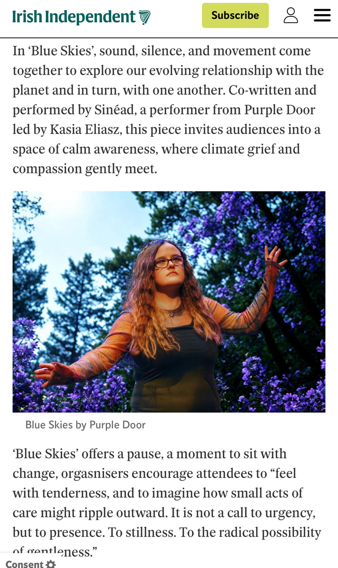 In Blue Skies, sound, silence, and movement come together to explore our evolving relationship with the planet - and with one another. Co-written and performed by Sinéad, a performer from Purple Door led by Kasia Eliasz, this piece invites audiences into a space of calm awareness, where climate grief and compassion gently meet.